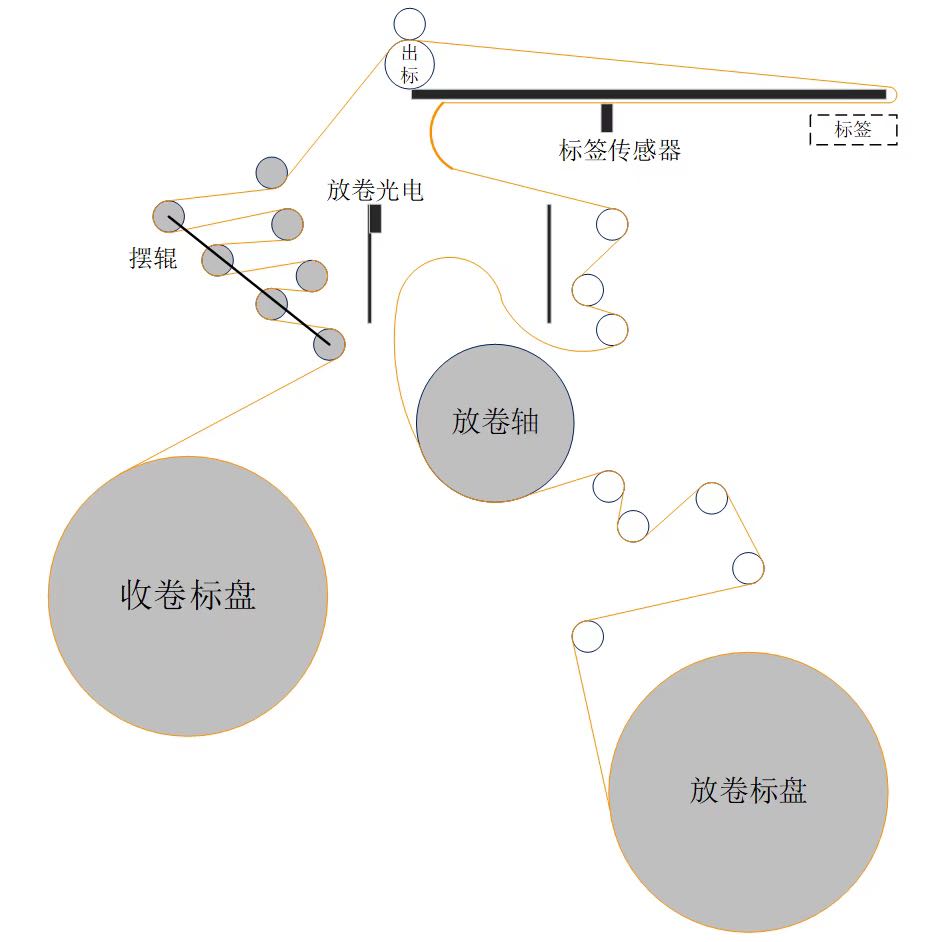 圖4是送標(biāo)機(jī)構(gòu)的示意圖,它是將標(biāo)簽放卷、牽引、送出、裁切的機(jī)構(gòu)構(gòu)成,可以由多種類型的標(biāo)站,采用收放卷的高速運(yùn)動控制技術(shù)來保障穩(wěn)定的張力,以為精準(zhǔn)送標(biāo)、切標(biāo)提供保障。